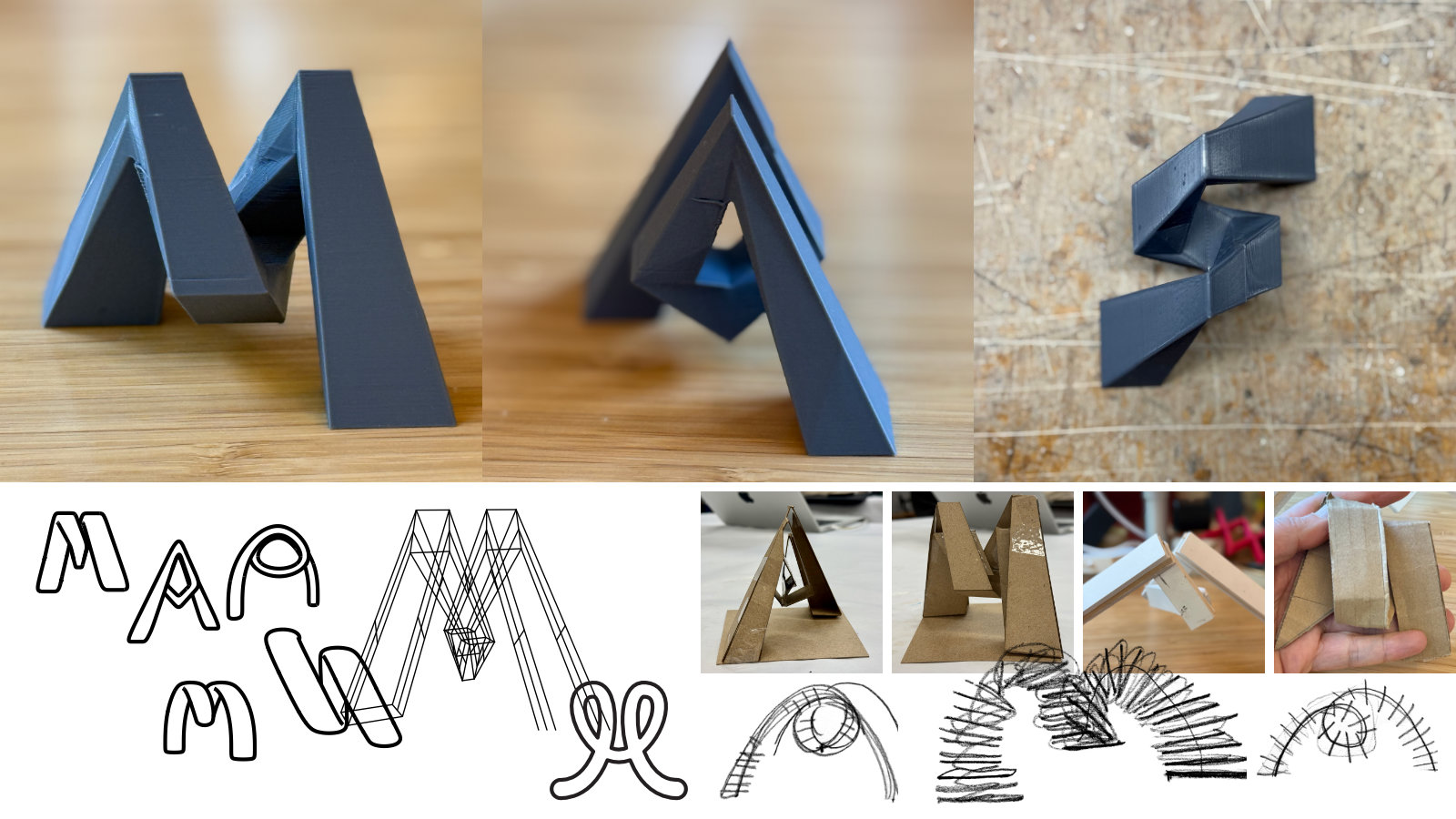 Early sketches explored a slinky-like form moving through space to create an M, but it felt more conceptual than fabricable. Working hands-on with cardboard, bending and twisting simple strips, led to an unexpected discovery: the letter "A," the first initial of my last name.