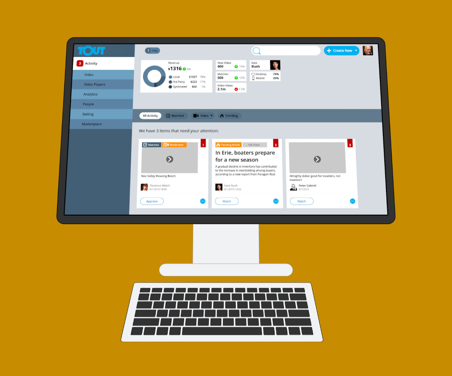 The challenge was a complete revamp of the publisher partner application experience. At times, we need the publisher to approve a video. A landing experience was created that would highlight tasks, show the value of Tout and expose new opportunities.