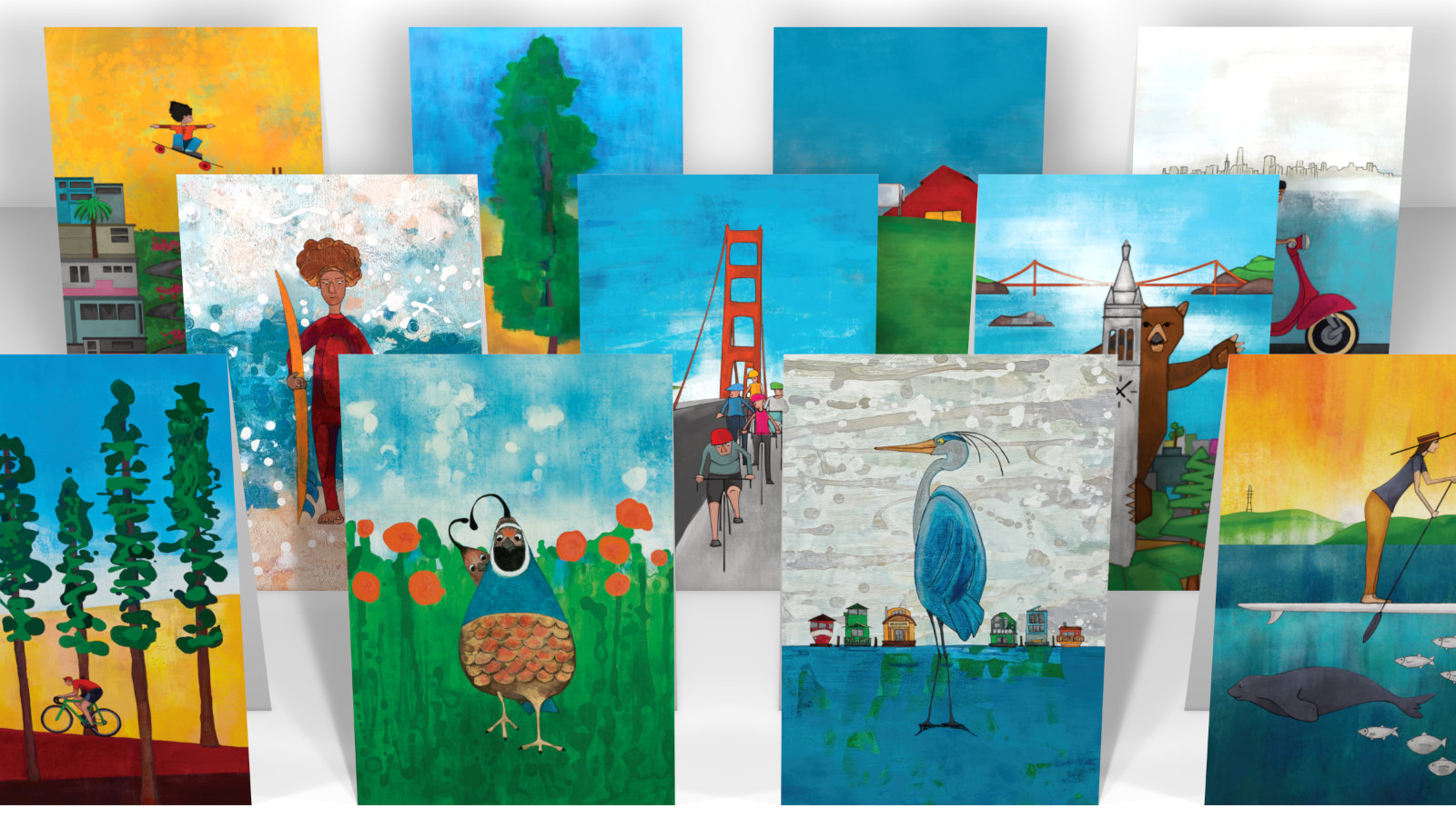 I rarely leave home without a sketchbook . I draw whatever strikes me and later some of those tiny sketches grow into bold, colorful paintings. During the pandemic, I began a series called “Paint Your Happy Place,” creating both acrylic and digital pieces. I started printing them and selling them in coffee shops, and eventually turned them into cards.