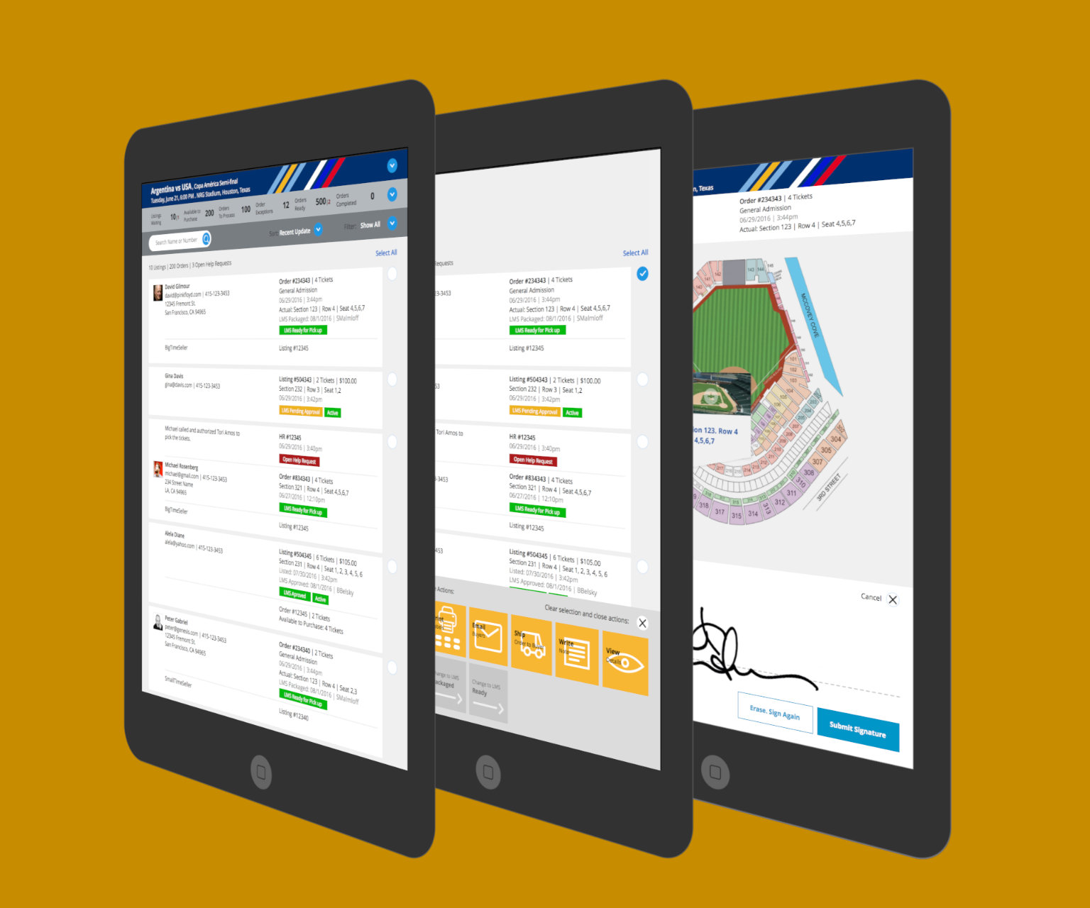 Solution: One of the key features designed was a smart action bar. Select one item and the action bar activates. Add to the selection and the available actions update. Some actions can be applied to multiple orders. The action bar is smart enough to automatically adjust to what is selected.
