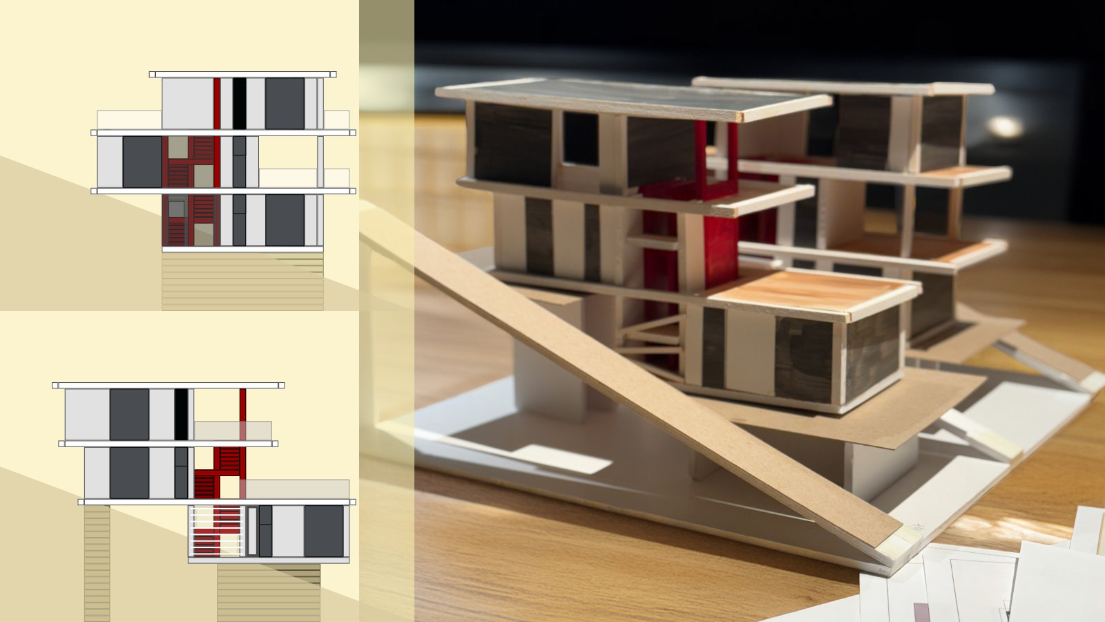 I designed two closely related cabins and explored the impact of placing the staircase indoors versus outdoors. I used bold red stairs to drive the character of the cabin. Much of the work focused on material exploration—painting foam board to suggest hardwood floors, windows, and plaster walls, and using painted balsa wood to construct terraced floors. While the materials warped and bent, the process was a useful experiment in how color and texture can help imagine spatial experience.
