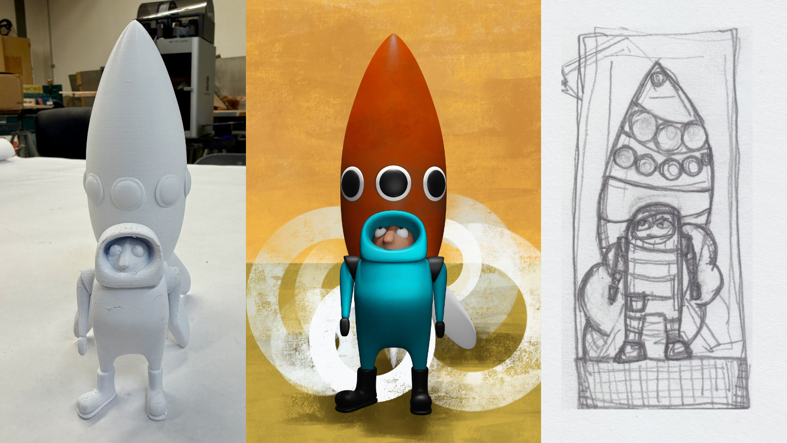 In this scene, Gorbi senses that something is going on behind him - and he's right.The spaceship is blasting off, jets roaring, and he's been left behind. His oversized helmet adds drama, but also creates tunnel vision - limiting his view and making it hard to grasp the full picture. He represents a feeling many of us know well: the fear of missing out, made worse by not being able to see what we're missing.
